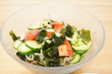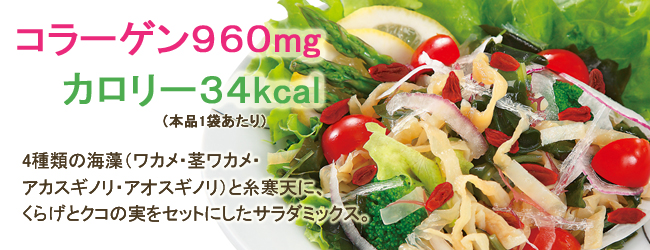 4種類の海藻(わかめ・茎わかめ・赤杉のり・青杉のり)と糸寒天に、くらげとクコの実をセットにしたサラダミックスです。本品で彩り豊かな海藻サラダが作れます。