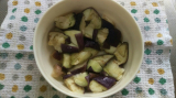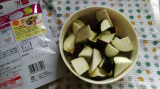 1)なす2本(約200g)を一口大の乱切りにし、耐熱皿に入れラップする。
