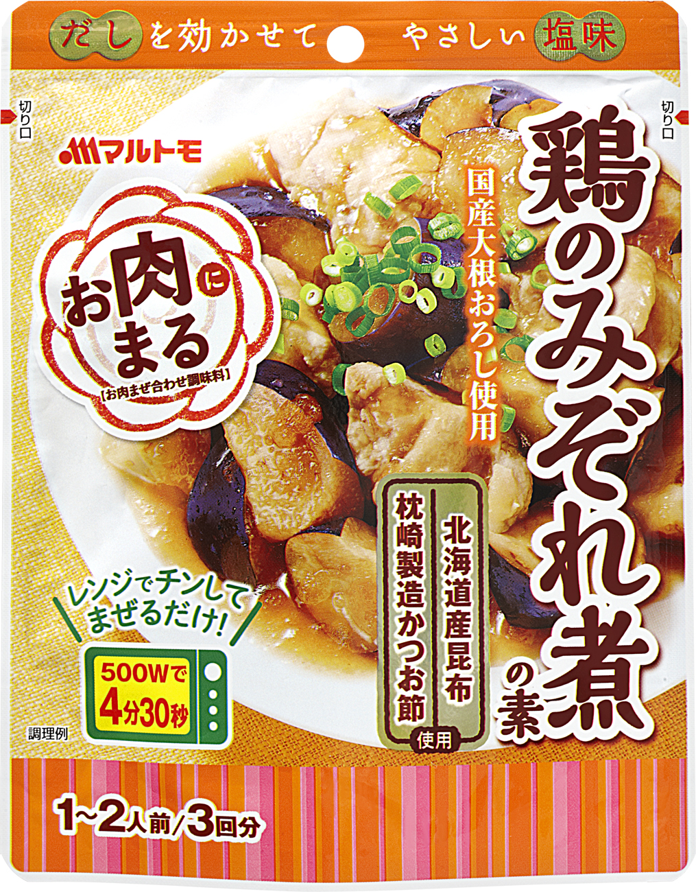 レンジでチンしてまぜるだけ! 健康や時短のために、油を使わないお肉料理をご提案します。 マルトモ「お肉まる(R)」は北海道産昆布と枕崎製造かつお節を原料に使用したお肉まぜ合わせ調味料。 鶏のみぞれ煮の素は国産大根を使用、だし香るほっこり仕立て! レビュー数 : 27 |