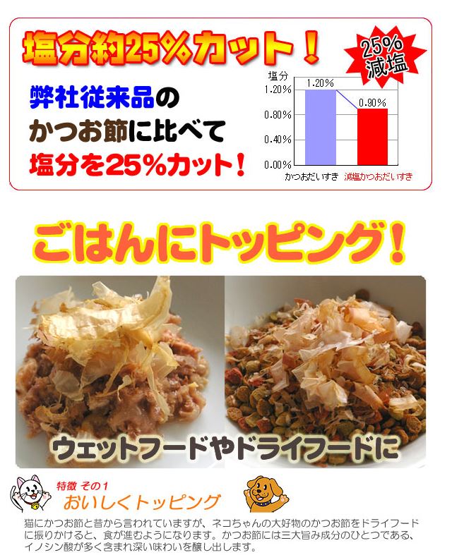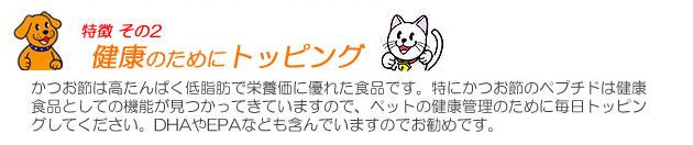 ・かつお節は高たんぱく低脂肪で栄養価に優れた食品です。特にかつお節のペプチドは健康食品としての機能が見つかってきていますので、大切な家族であるねこちゃん・わんちゃんの健康管理のために毎日トッピングしましょう。DHAやEPAなども含んでおり、おすすめです。