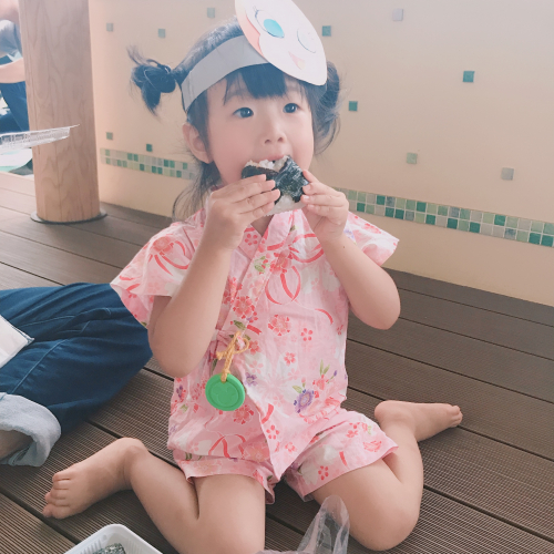 ✔大好きなおにぎりを頬張るこどもの写真