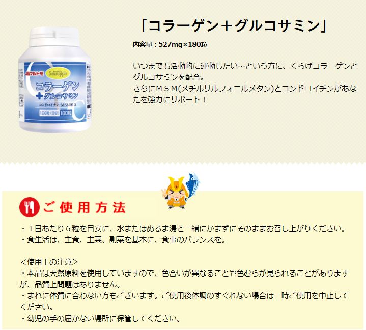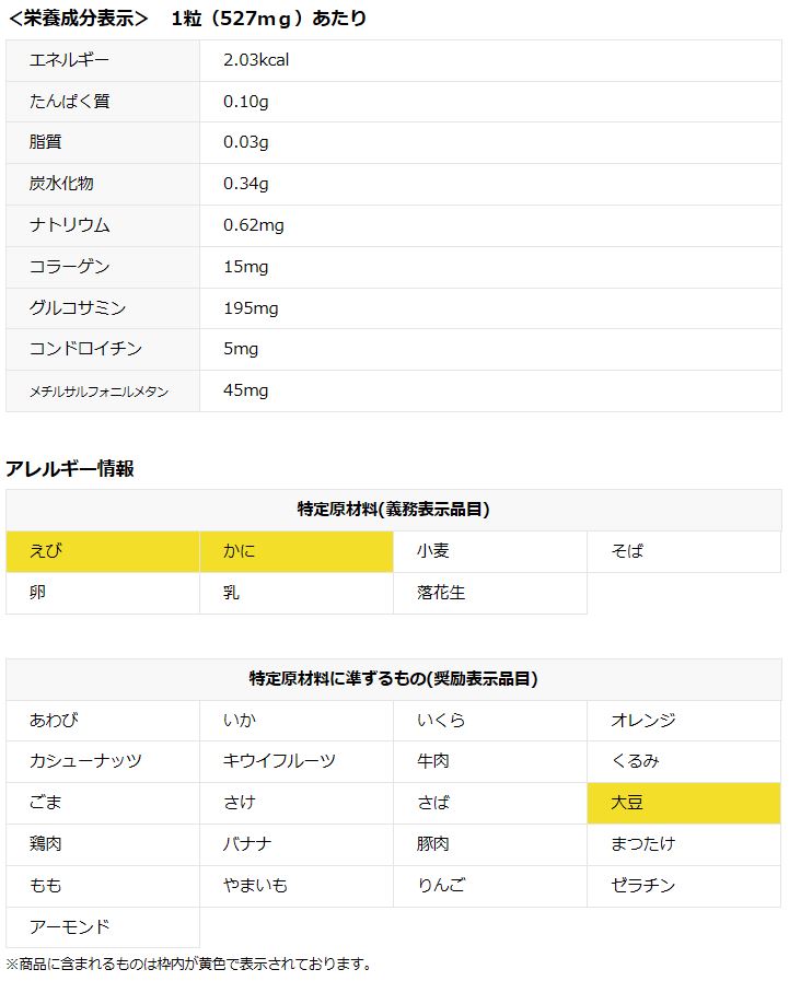 ◆原材料名:グルコサミン(えび、かに由来)、コラーゲンペプチド(くらげ)、メチルサルフォルニルメタン、サメ軟骨抽出物、西洋ヤナギ抽出物、コーンスターチ、プルラン、ショ糖脂肪酸エステル