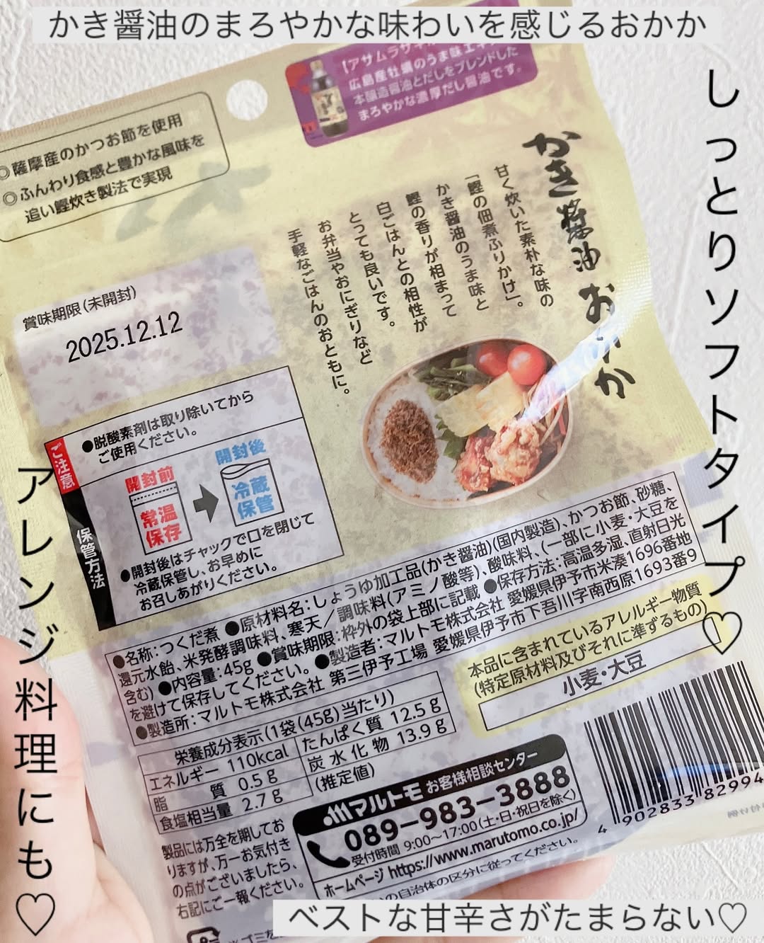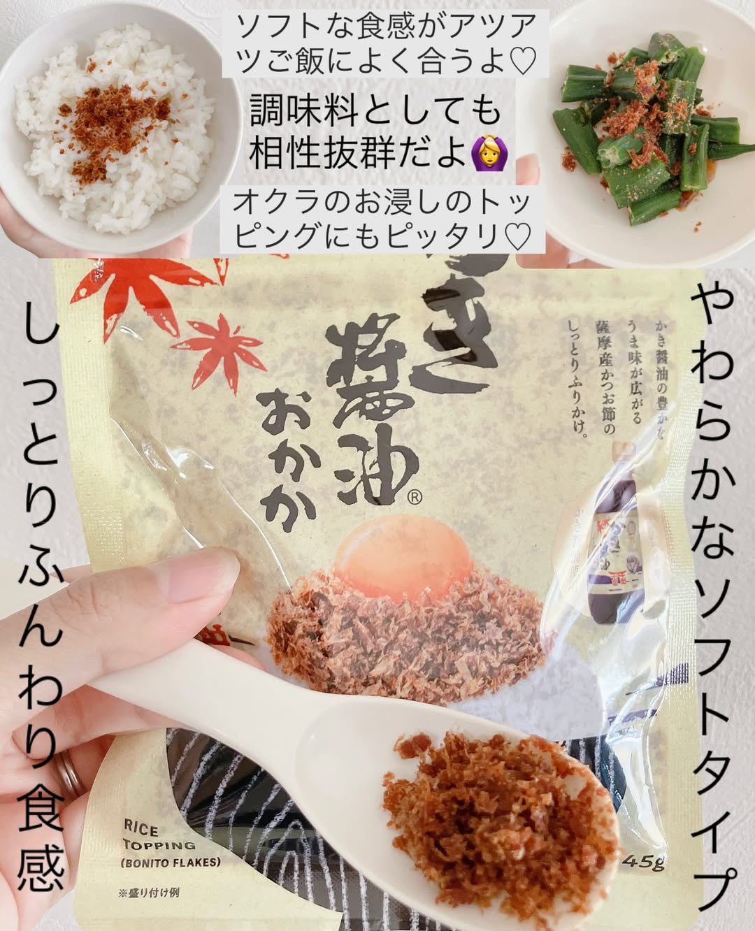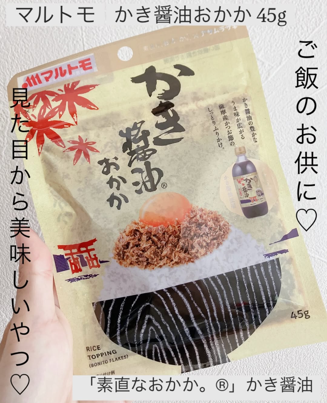 ♡いいね👍フォローお願いします♡ マルトモ かき醤油おかか 45g 「素直なおかか。®︎」かき醤油 @prebushi_marutomo 様から商品をご提供 いただきました♡ありがとうございます🙇♀️💕 ご飯のお供にピッタリ♡ 見た目からして美味しいのわかるよね! 「アサムラサキかき醤油」入りで、かき醤油の まろやかな味わいとしっとりソフトタイプの かつお節のふんわり食感がたまらないよ♡ アツアツご飯によくなじんで相性抜群だよ! ご飯だけでなく、いろいろな食材と合わせて 調味料としても使用できて、私はオクラの浸 しのトッピングとしてかけてみたらよく合っ てとてもまろやかな味わいを感じられたよ♡ アレンジ料理にも色々と使用できるの良い! 薩摩産のかつお節とかき醤油などこだわりの 原材料を使用していて、「追い鰹炊き製法」に より、かつお節のふんわり食感とやわらかで マイルドな味わいがたまらないよ♡ アツアツご飯に相性抜群でお箸🥢がとまら ないよ〜🍚☺️💕 ぜひお試しを〜💁♀️♡ #PR #マルトモ株式会社 #マルトモ #マルトモの食品ロス削減 #monipla #marutomo_fan