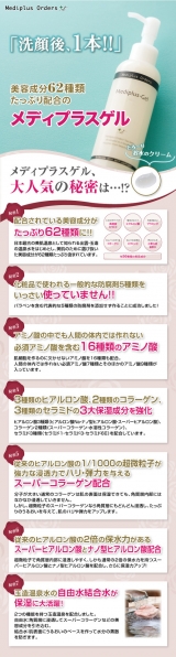 こちらにずーっとお世話になりました! メディプラスオーダーズ さんの、 メディプラスゲル です 化粧水、乳液、美容液の役割をコレ一本の ワンステップ! しみしわたるみ毛穴などの肌悩みを しっかりサポート! 美容成分がたっぷり 62種類! そして モンドセレクション… 2013/01/20