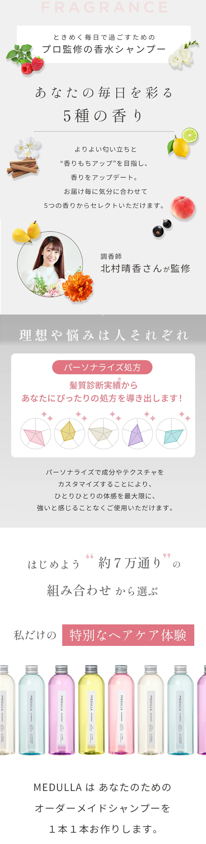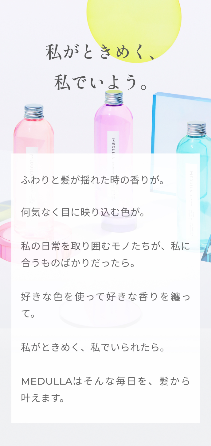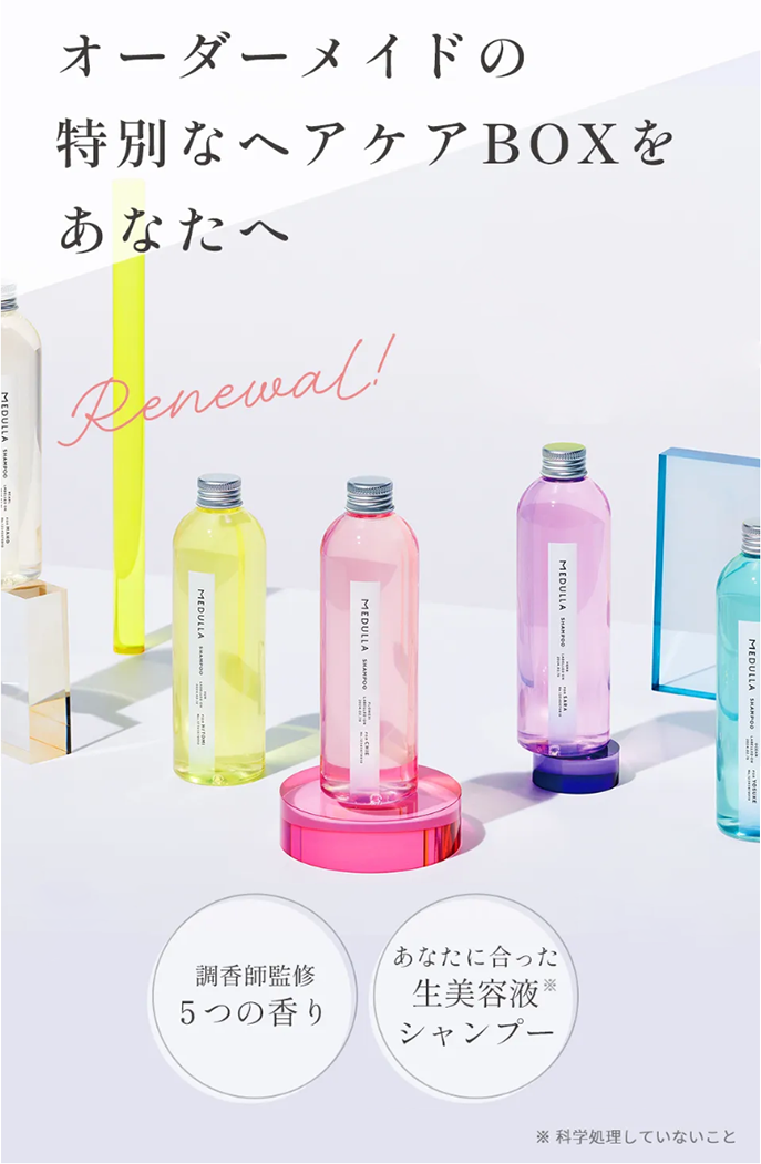 髪の個性や悩みは本当にさまざま。気候や日々の生活、年齢によっても変化していきます。だからこそ単に高級なものや人気のあるものを使うのではなく、自分の今の状態に合った本質的に意味のあるものを選んでいただきたい。その想いから私たちは簡単にあなたのための処方をお届けするカスタマイズヘアケアBOX「MEDULLA(メデュラ)」を開発しました。