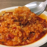 フレッシュなトマトをベースにした特製トマトソースをもち麦入りで硬めに炊いたピラフにかけ、彩りのよいパセリとカットトマト、北海道十勝産モッツァレラチーズとゴーダチーズをトッピング。