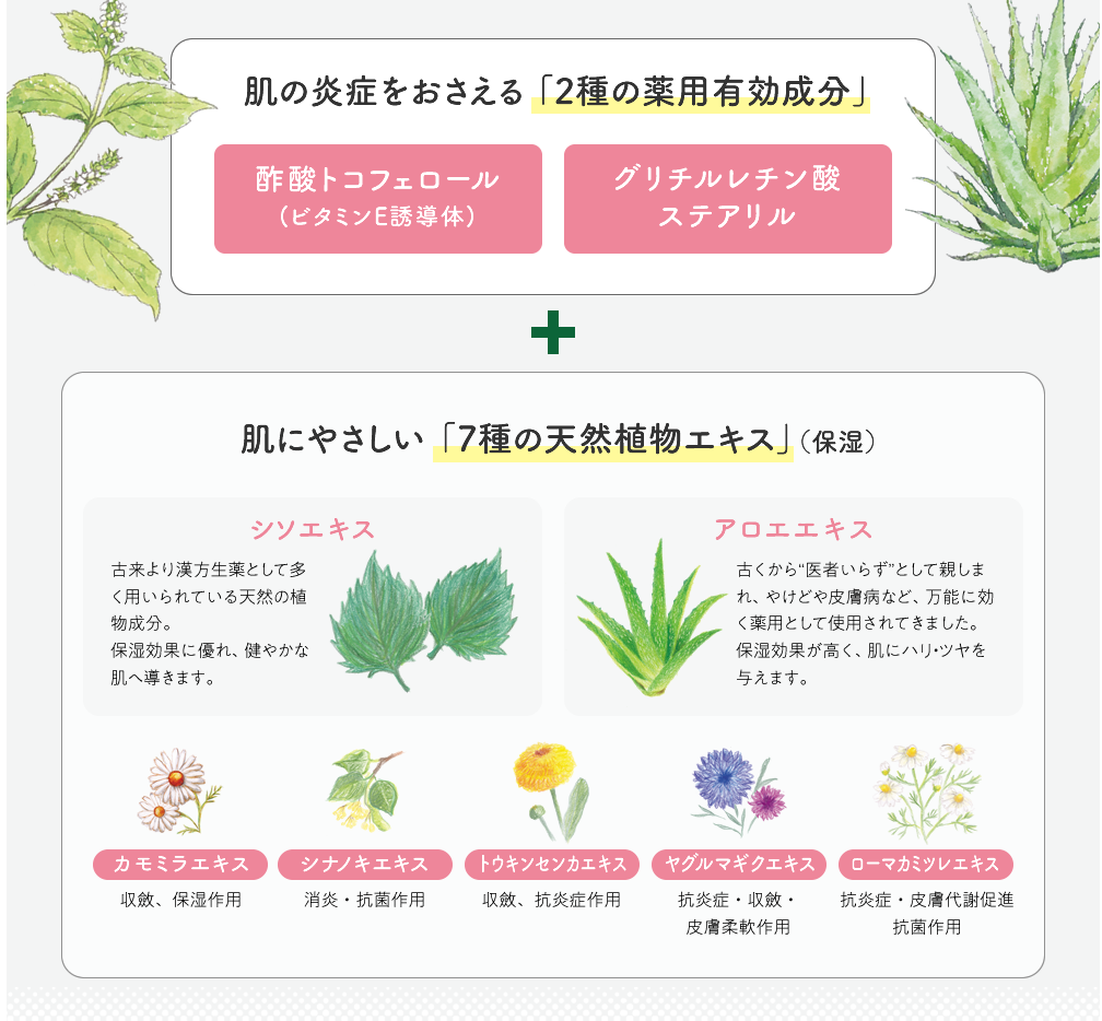 2種の薬用有効成分と天然植物エキスを豊富に配合!