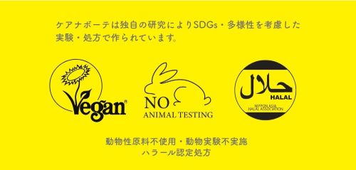 動物性原料不使用・動物実験不実施・ハラール認定処方・界面活性剤不使用・合成着色料不使用・シリコーン不使用