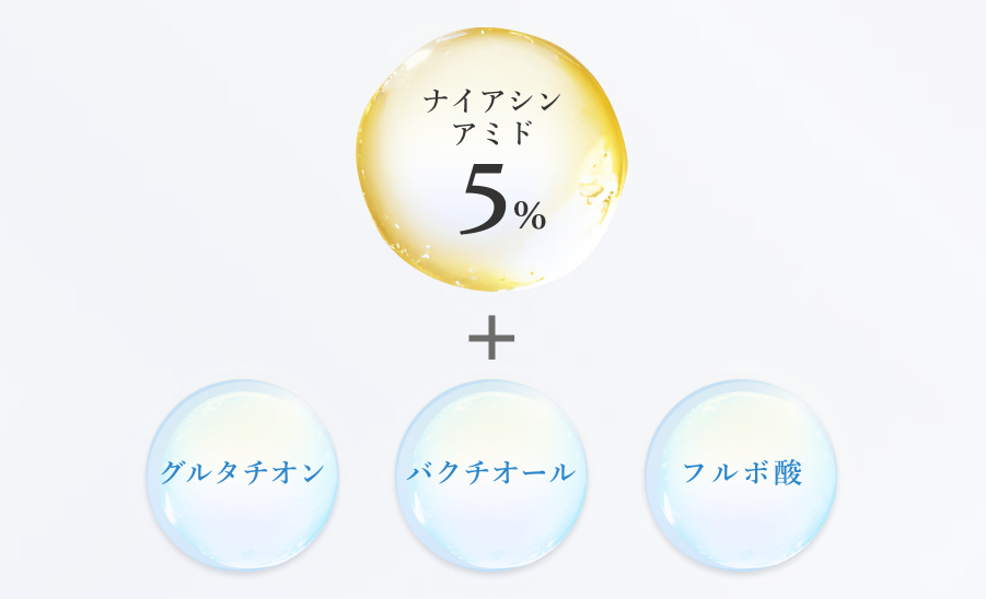 ナイアシンアミド高濃度5%配合で、スキンケア効果が高く、つけた瞬間たっぷりのうるおいで満たし、日中の乾燥も防ぎます。