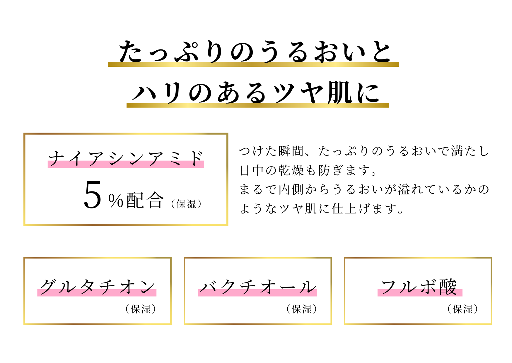 ナイアシンアミド高濃度5%配合で、スキンケア効果が高く、つけた瞬間たっぷりのうるおいで満たし、日中の乾燥も防ぎます。