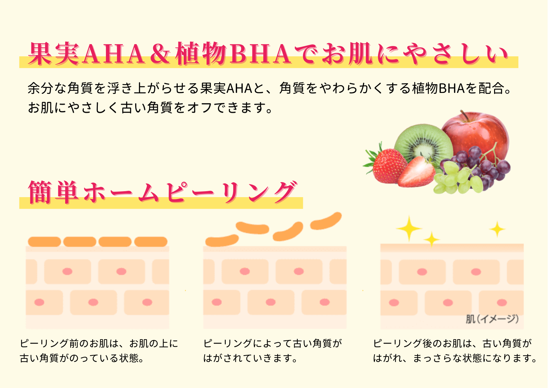 余分な角質を浮き上がらせる果実AHAと、角質をやわらかくする植物BHAを配合。合成着色料、鉱物油、アルコールを配合していないため、お肌にやさしくピーリングが行えます。