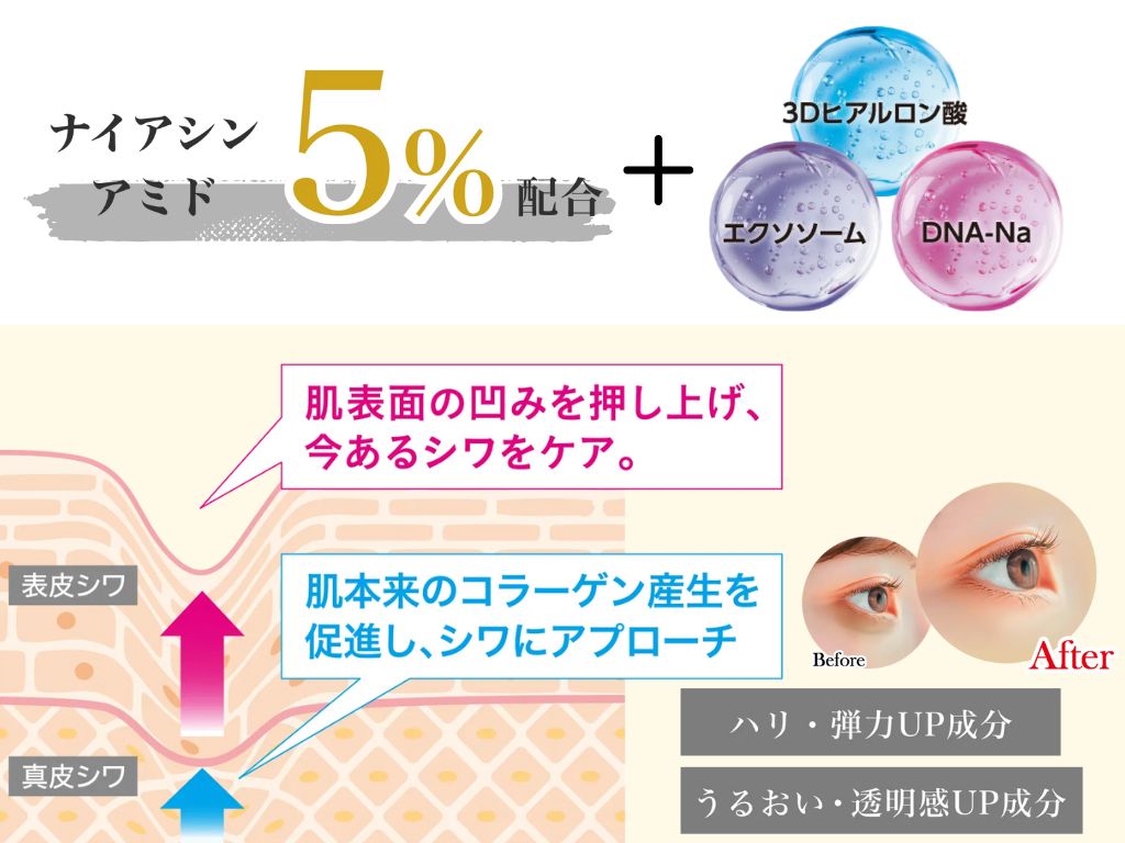 シミ・くすみ・小じわにアプローチする【ナイアシンアミド 】をはじめ、エクソソーム・PDRN・3Dヒアルロン酸など