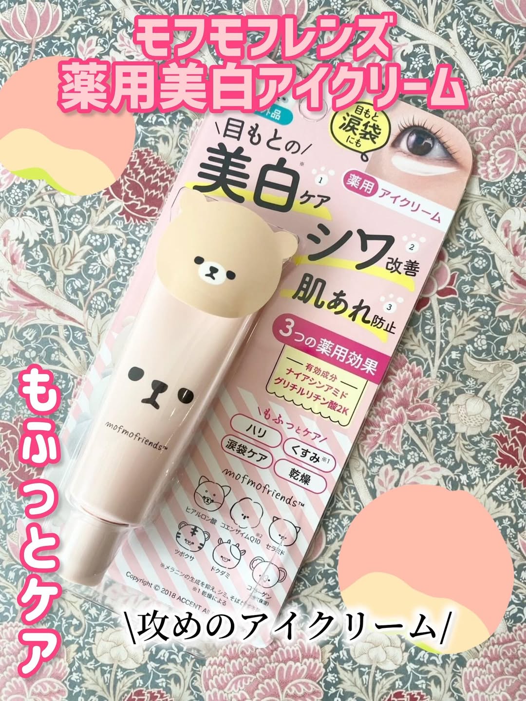 モフモフレンズ薬用美白アイクリーム 可愛いだけじゃない。本気の“攻めアイケア”始めよう! モフモフレンズシリーズ初 【ナイアシンアミド&グリチルリチン酸2K】 W有効成分配合。 とにかく可愛いアイクリーム。 可愛いだけじゃなくてちゃんと実力派。 使いやすいチューブタイプで こっくり濃厚なテクスチャながらとても 肌なじみが良いです。 べたつかないから朝でも使いやすい。 香りは結構強めな甘い桃のような香り。 べたつく時期でもアイケアは怠りたくないので、、 毎日可愛いこの子に癒されながら頑張って スキンケアしていきたい。 こんなに高機能だけど、お値段とってもリーズナブルです。 ほかのモフモフレンズのスキンケアも集めたくなります。 #PR #株式会社明色化粧品 #モフモフレンズ #アイクリーム #シワ改善 #美白ケア #肌荒れ防止 #monipla #meishoku_fan