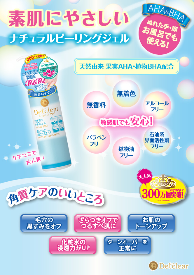DETクリア ブライト&ピール ピーリングジェリー (無香料タイプ) 大人気のピーリングジェリーに、やさしい無香料タイプが登場!気になる部分につけて軽くマッサージすれば、すぐにポロポロ♪ レビュー数 : 642 |