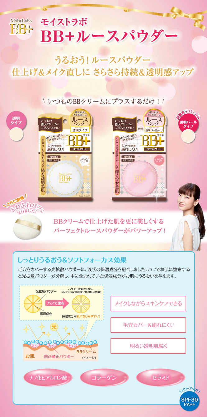 いつものBBクリームにプラスするだけで、メイクをさらに美しく仕上げる、どんなBBクリームにも相性ピッタリの『モイストラボ BB+ ルースパウダー<透明タイプ>』『モイストラボ BB+ ルースパウダー<透明パールタイプ>』のモニターを各50名、合計100名様募集いたします!