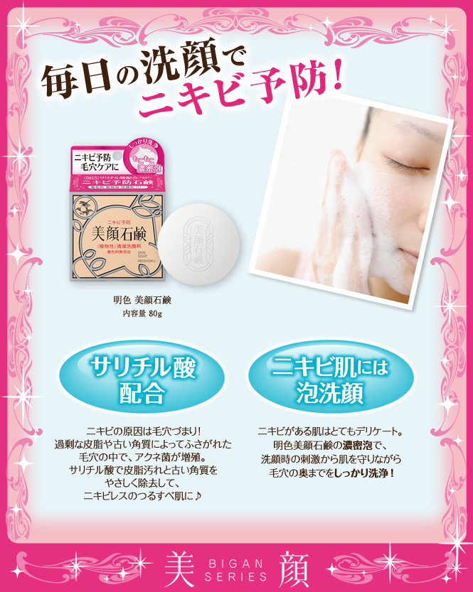 季節の変わり目には、いつの間にか、どこかしらにニキビが生まれてる私 ニキビ予防によいという「明色美顔石鹸」を使ってみた 80g 本体価格500円 角質を柔らかくするサリチル酸配合 毛穴の汚れをしっかり洗浄し、刺激を与えない弾力泡で洗える設計らしい 着色料鉱物油防腐剤フリーの… 2014/06/05