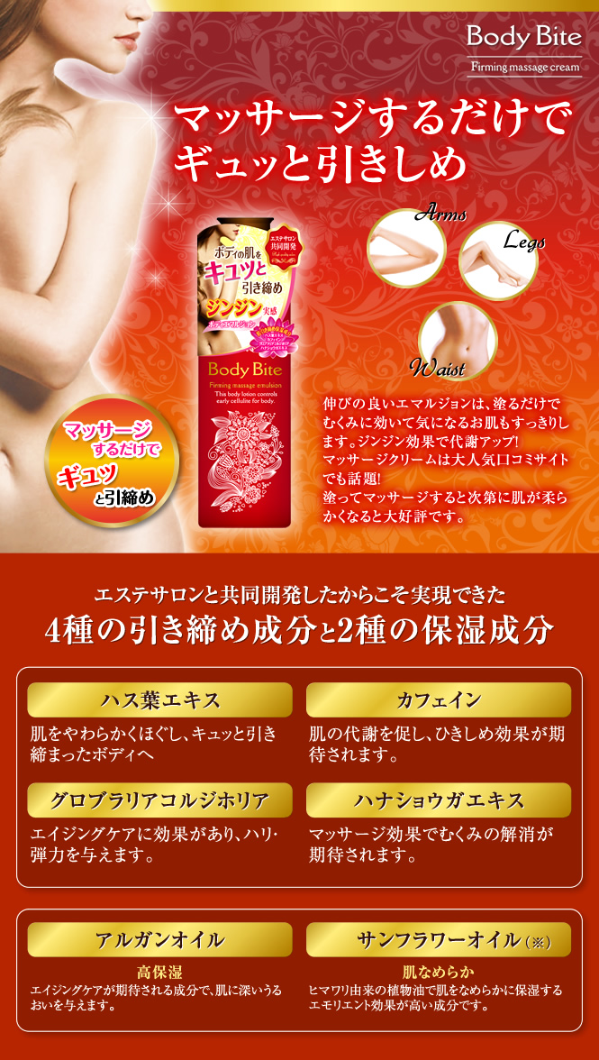 * * * * * * *ボディバイトファーミングマッサージエマルジョン明色化粧品(190ml / 1,900円)エステサロンとの共同開発により、エステサロンで、販売されているマッサージクリームの肌引き締め成分と同量の成分を配合したボディ用乳液気になる部分を直接マッサージすることでボディの肌をキュ… 2015/08/08