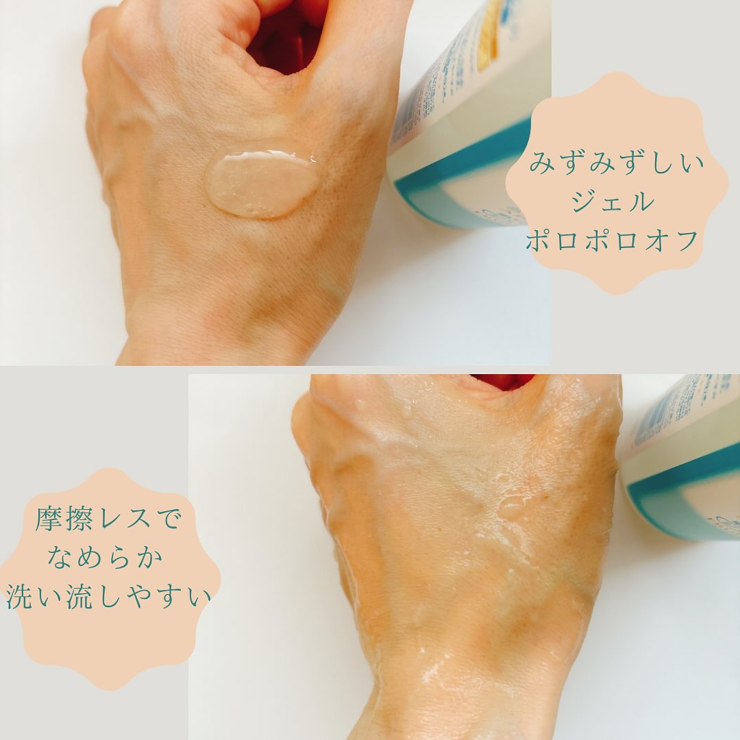 濡れた手や顔にも使えるので、お風呂で手軽にケアできるのが良いですね。透明なジェルを肌にのせて優しくマッサージすると、ポロポロがわかります。