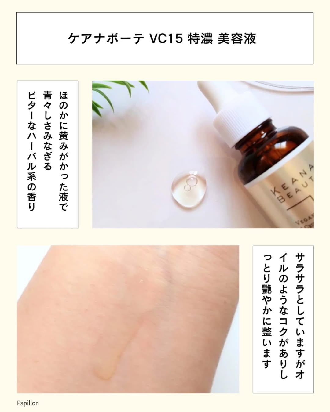 高濃度のビタミンを配合している美容液の特徴とも言えるほのかに黄みがかったサラサラとした液は厚みのないオイルのようにまったりとしたコクがほんのりあり個性的な質感が面白いです