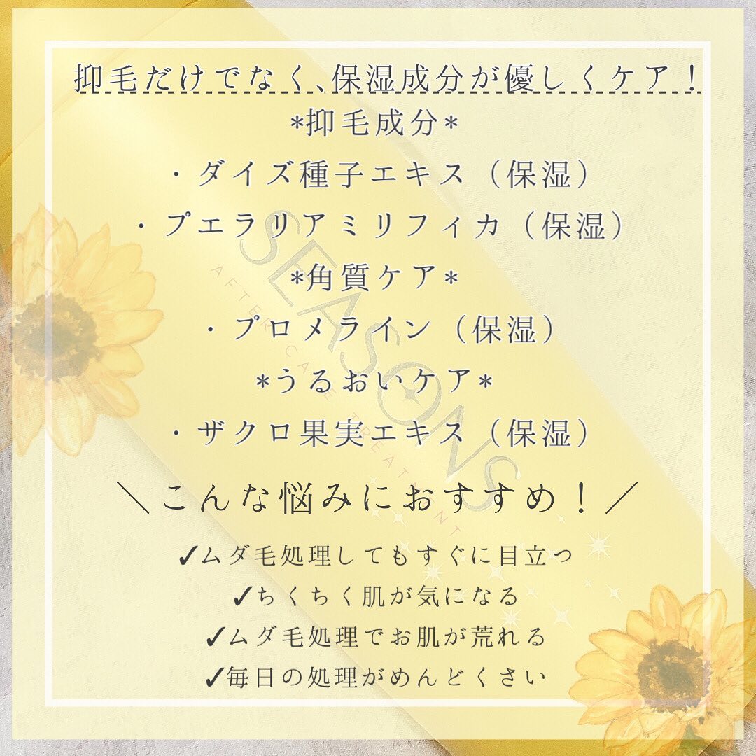 #シーズンズ #シーズンズアフターケアトリートメント #ムダ毛ケア #抑毛ローション #ムダ毛対策 #肌みせ #角質ケア #除毛ケア #SEASONS #monipla #meishoku_fan