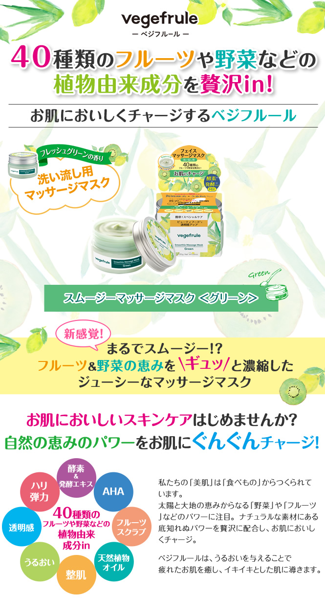 明色化粧品のベジフルール スムージーマッサージマスク〈グリーン〉 を使ってみました 40種類ものフルーツや 野菜由来の成分を贅沢に配合した、 洗い流し用のフェイスマスク クレジング後に軽くマッサージし、 そのまま2分間マスクすることで、 もっちりとしたつるすべ肌に導きます これ一つでピー… 2016/05/13