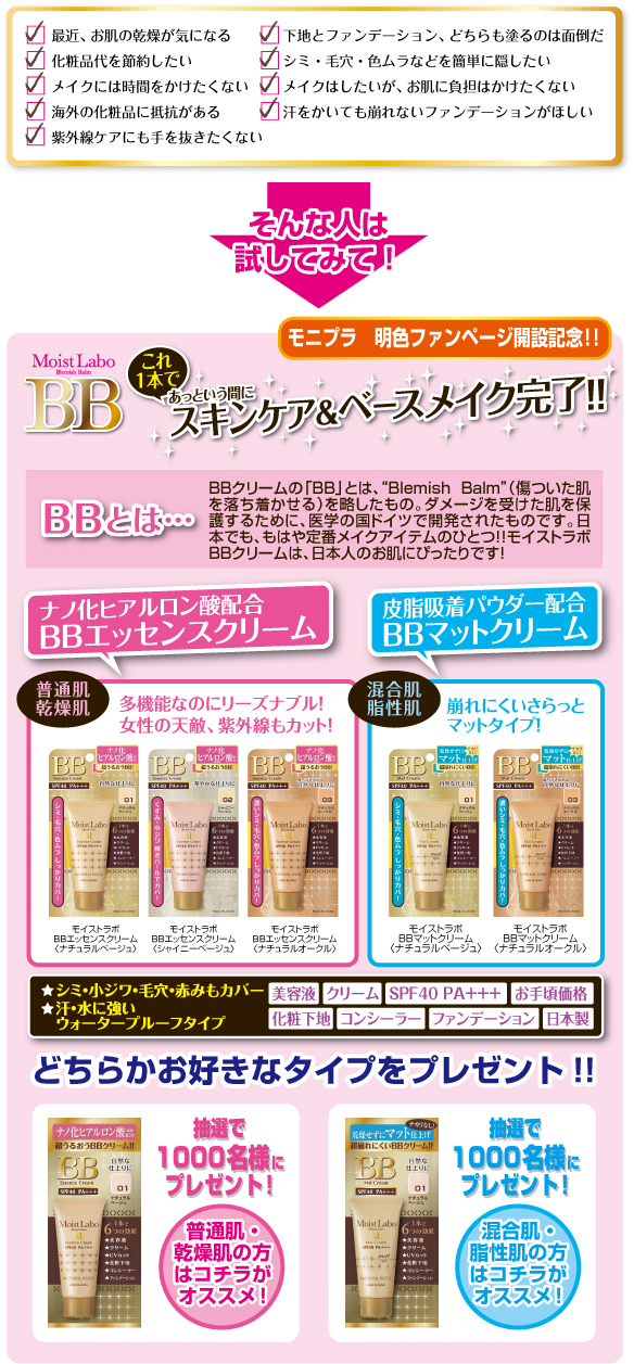 モイストラボBBエッセンスクリームorBBマットクリーム<2000名プレゼント>BBクリーム!なんと2000名が当選するモニターです(∀)そろそろメイベリンのBBクリームもなくなるからタイミングよくモニター参加できればBBクリームだけでお肌整えたいよね(笑) 2011/10/31