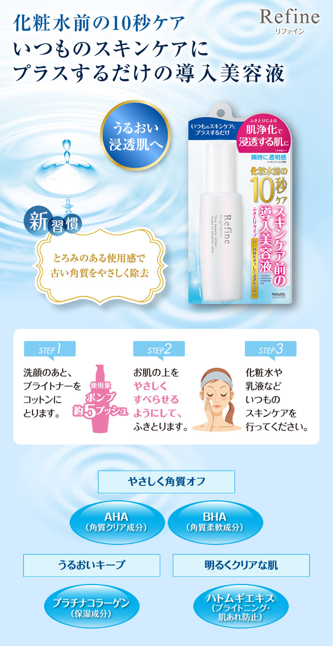 使い方はとってもカンタンオ♪♪ クレンジング→洗顔→リファイン ブライトナー 角質クリア美容液 →化粧水→クリームまたはジェル 透明でとろものあるテクスチャーです コットンに含ませて使います とろみがあるから肌への浸透は どうかな?と思いましたが … 2014/08/28