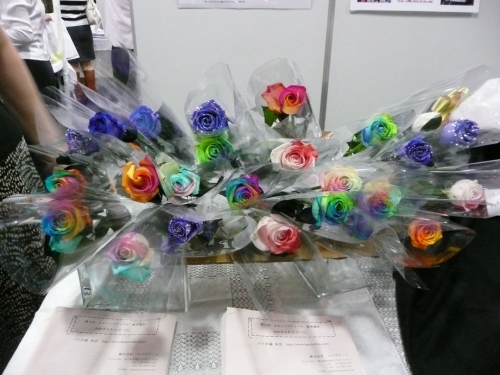 バラ市場というショップのカラフルなバラです 茎から色水を吸わせて色を付けているそうです この中の青いバラをプレゼントでいただきました