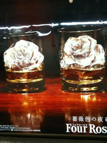 帰宅途中の駅のホームで見かけた看板一つずつちゃんと手でシェイビングされたであろうロックアイスが見事なまでに「バラ」の形! 琥珀色のバーボンの中でゆっくり溶けていく様を想像したらなんだかバラの香りが漂ってくるような気がしました♪