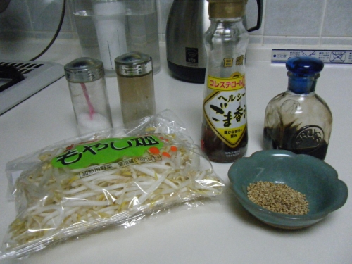 ひっ!締め切りまで時間がなーいっ!!! …ということで、私は材料を取り急ぎとっちゃいましたあは 【みつばち家:ナムル】 さっとゆでたもやし、白ごま、塩コショウ、醤油、ショウガ、ニンニクを和え、最後にごま油で風味付け!ほんとは豆もやしがいいんだけどな