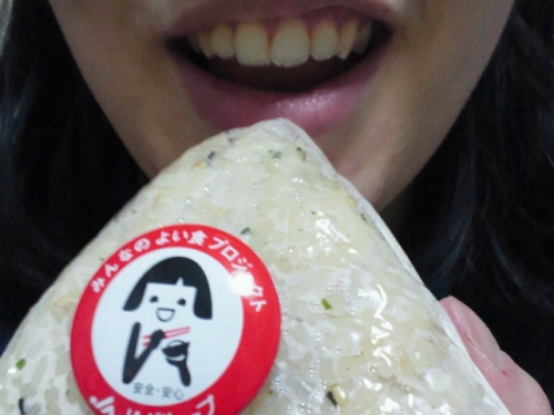 やっぱり日本人は米です!大好きなおにぎりを笑味ちゃんごとパクりとしようとした写真です