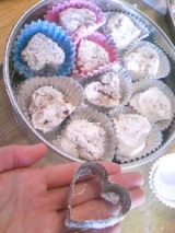 共立食品お菓子大好きの会 ファンサイト応援中 明日、専攻の人たちで 修士論文発表終了お疲れ会があるので その時に持って行こうと思って、今日から準備中です まずは、キットで頂いたこちら いちごのホワイトトリュフ これを作ります 湯せんで溶かして キットに入っているのは、丸いチョコレートなので 板チョコみたいに、割ったり削ったりしなくて良くて、楽ちん フリーズドライのいちごを入れます フリーズドライのものをそのまま入れると 白いトリュフに赤いフリーズドライのいちごが、 まばらにあるようなトリュフに 袋の上から指でつぶしてチョコレートに溶かすと ピンク色のトリュフに それから、チョコに混ぜずに、最後にまぶすと 赤いトリュフに なるそうなんです 私は、半分くらいつぶして 薄いピンク色のトリュフにまばらなフリーズドライ・・・風 にするようにしました笑 色んなバリエーションが楽しめて面白い 3種類に分けるのは大変だから、 キットを3つ買って、3種類作ったら、 楽だし詰め合わせるときも可愛くて良いですよね ちょっと置き目に丸めたら、 15個用なのに11個分になってしまいました・・・ 粉砂糖をまぶすとより淡いピンクに 可愛い笑 これを包むオーロラシートまでついてますよ 準備するのは、生クリーム大さじ15でいいなんて、楽 忙しいときには、ぜひまた活用させてもらいたいです 次にギモーブ ほとんど共立食品さんのレシピ通り、だけど、 ゼラチンに混ぜるお砂糖を40g減らして甘さ控えめに コーンスターチをまぶしたバットを用意 ゼラチンを水でふやかして、湯せんで溶かします そしてお砂糖を入れておきます 卵白を泡立てて この中にゼラチンを溶かした液を少しずつ入れて、 混ぜ合わせます 半分に分けて ココアパウダーとフリーズドライいちごの粉を お湯に溶かしたものをそれぞれに入れて バットへ流し込めば冷やして完成 ギモーブを作れるというだけで、 私はとりあえず興奮していたのですが、 これは、手早く、と、あらかじめ、というのが とっても大事なレシピだなと思いました ココアパウダーとフリーズドライいちごの粉は、 先にお湯に溶かしておいたほうがいいかもしれません ゼラチンを卵白に混ぜてから溶かそうとしていたら、 卵白が先にプレーンのギモーブになっちゃってました 何とか混ぜ合わせましたが、バットに塗りつけるような形に・・・ ゼラチンもしっかりと湯せんで溶かしておかないと、 固まらなくなってしまうのでご注意 途中で、卵白の中でゼラチンがぶちぶち見えていたので、 おっと、これはいけないと思い、 残りはさらに湯せんを行ってから、混ぜ合わせました ハート型でくりぬいた完成図はこちら 次作るときは、もっと色んなことに気をつけたいけど 1回目にしては、上出来かな笑 続きを見る ['close']