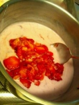 ハウス食品 フルーチェファンサイトファンサイト応援中 前にとっておいたカップに フルーチェで作った苺のババロアを注いで固めましたぁ 結構良くできた♪ヽ(´▽`)/ 家族には好評でしたぁ みんなのところへ持っていこうかなぁ…(x)ゞ♪ どうしよっかな? 行こうかなっ♪(笑) レシピは色々見ながら適当にアレンジ(笑) 牛乳130mlでフルーチェをつくります♪ 生クリーム200ml にお砂糖大さじ1杯を入れて良く泡立てて♪ 粉ゼラチンは7g位をふやかして、電子レンジ20秒ほどでとかします 苺は10個くらいスライスして、きれいなものは器の壁へ♪ 他のは切って、フルーチェの中へ そうしたら、フルーチェに溶かしたゼラチンを加え 良く混ぜたら、生クリームの中へ さらに良く混ぜて、器に注いだら 冷蔵庫で一時間♪ 出来上がり(´∇`) 今回は苺にあまおうを使いましたぁ(≧∀≦) ババロアの中でも甘さを遺憾なく発揮して 美味しく出来上がりました(笑) 器の周りに外から見えるようにしたのも 我ながら良かったかも(笑) 自画自賛です お届けに上がります♪ヽ(´▽`)/ みんないるかなぁ? ハウス食品 フルーチェ 続きを見る