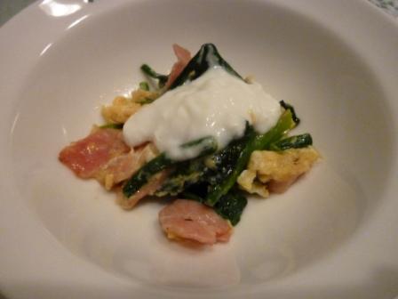 ホウレン草の温野菜とベーコンにオリーブオイルをかけてサラダにしましたメインにもなる一品です