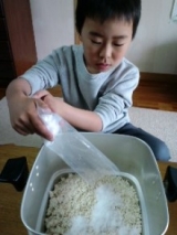 タイトルの「みそだいずくん」ってって思いますよね それはモニプラさんとSAVAWAYモール さんのモニター企画でおうちでてまえ味噌 さんの「あなたも味噌職人米味噌」を送っていただいたのでかずと一緒に作った味噌の名前です なんてセンスのない名前かしら かずが一生懸命考えたけどこの名前しか思いつかなかったんですって(苦笑) さて、「あなたも味噌職人米味噌」は完全無添加で自宅でお味噌を作れるキットです 内容は米こうじ塩つぶした大豆 自宅でこれを手順にそって混ぜれば簡単に作れるそうです と、いうことでかずと二人で初自家製味噌つくりを体験しました 米こうじに塩を入れて混ぜます 米こうじが固まっている部分もあったので塩を混ぜる時にバラバラにしてみました きちんと塩がまんべんなく混ざったかチェックして 潰した大豆を投入 こちらは煮て潰した大豆と煮汁塩が混ざったものだそうです 後はひたすら混ぜて混ぜてこねてこねてをくり返しました この米こうじと大豆を混ぜてこねる作業が結構力が要るんですよ 思ったよりも大変でびっくり どの程度混ぜたら美味しくなるのかわからないまま一生懸命二人でこねました 美味しくなると良いねと愛情を注ぎながら 用意していた保存用の容器に移してお山にもってラップでカバー お味噌の名前を「みそだいずくん」と命名し日付と作ったかずの名前を書いて出来上がり 後は熟成するのを待つのみです 今の時期だと2ヶ月3ヶ月ぐらいだそうです 丁度、6月の株主総会シーズンが終わり一段落した頃が食べごろかしら 小学生のかずには丁度良い体験になってよかったです 美味しくなったら良いねと二人で作ったので美味しくなってくれることを祈るのみ 学校の自由研究などでも使えそうなテーマかもしれませんね 家にある「菌」はその家々によって違うので同じキットを使っても同じ味噌にはならないそうです わが家の味噌はどんな味になるかしら 4キロのお味噌が出来るそうなので熟成して美味しいおみそ汁が朝飲めるのを楽しみにしたいと思います SAVAWAYモールファンサイト応援中 ブログネタ:あなたが外国人だったらどの漢字のTシャツを着たい? 参加中 本文はここから 漢字のTシャツですが「麹」はどうかしら 画数も多くてかっこいいかなと思います 今回の味噌作りでかずは「こうじ」と言う言葉をはじめて覚えたんですよ 頭の中は残念ながら「ひらがな」ですけどね(笑) 続きを見る ['close']