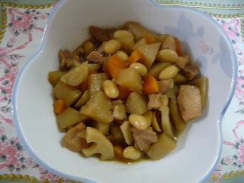 こんにゃく、れんこん、ごぼう、鶏肉、にんじんを切って鍋にごま油を入れ 切ったものを入れて炒め水、ほんだし、しょうゆ、みりん、料理酒、砂糖 を入れてあくをとりながら煮込みますにんじんがやわらかくなったら ドライパックの大豆を入れてさらに煮込みます 煮汁が少なくなってきたら火を止めます