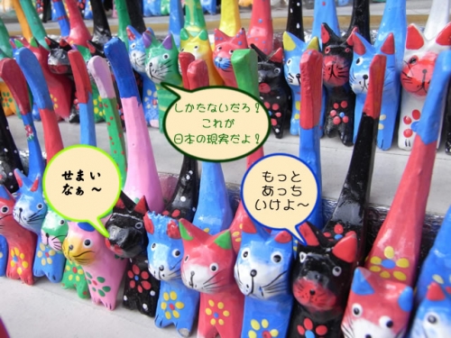 鎌倉駅のすぐそばにあるアジアン雑貨やさんで発見したネコ軍団 きっとこんなことしゃべってるんでしょうね