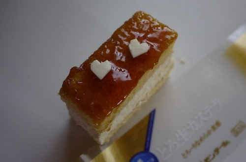初めて買った、とろ生カステラの上に、チーズで作った小さなハートを2つ乗せました チーズと結構合いましたよ! とろ生カステラは、めちゃくちゃ美味しかったです本当、とろ生って感じでした