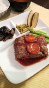 昨日の朝のblogで旦那さんのhelpがないよって、 愚痴ったからか??!!NO残業DAYだからか??!! 19時には帰宅した旦那様(一昨日は1時だったのにね) 平日なのに4人揃って晩御飯 ご飯 お味噌汁(じゃがいも、コーン) トマトバーグ、アスパラ 韮の麺つゆ漬け、きゅうりのピクルス 茄子とツナのくたくた煮 YOMEちゃんのトマトいっぱいミートローフ を見て美味しそう! って思ったんだけど、オーブンで40分も焼いている時間がない! そんな訳でルクエで7分くらいかな?チンしました ピーマンもチーズも入れてないけれど トマトは中にも上にもたっぷり! ジューシーお肉に、ちょっぴり酸味のトマトが夏バーグって感じで ソースは、肉汁&赤ワイン&ケチャップ&ソース ソースは、モニプラさんで頂いた 肉、魚、化学調味料、保存料等の添加物を一切使用していない、 有機野菜で作ったソース 10gのミニサイズなのでお弁当にぴったり! なのですが、旦那さんの勤務先が変更になりお弁当お休み中 (新しい勤務先は社員食堂があるのです) お弁当復活したら、大活躍してくれそうです! 美味しい菜食生活のソーファファンサイト応援中 にほんブログ村 続きを見る ['close']