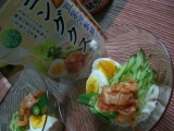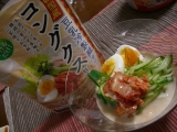 韓国風 豆乳冷製麺コングクス マルサンより韓国風豆乳冷製麺コングクス用スープのモニター品が届きました マルサンといえば豆乳ドリンクで有名なメーカー 豆乳を使って作る韓国料理でも活躍するんですね 寒い日が続いたので、季節が暖かくなるのを待って作ってみました 本場でコングクスを食べたことはないのですが、麺は手軽に素麺を使っています 具材はゆで卵、きゅうり、オクラ、そして絶対欠かせないのがキムチ!です 茹でて冷やして水切りした素麺に、具材を準備OK 後は、冷蔵庫で冷やしておいたコングクススープをかけるだけ 当たり前だけどw豆乳色したあっさり系のスープです はい出来上がり 暑い夏や食欲の落ちた時に簡単に作れて便利便利 素麺だけじゃ栄養面が偏るって時に、これは良さそう! 味は薄味なので… 続きを見る ['close']