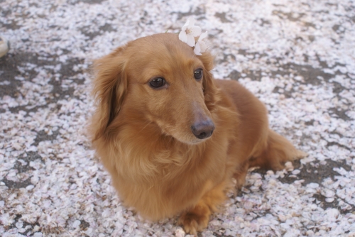 ダックスのモカ(7才) いつもは花よりお肉?ですが、今日はちょっぴりおすまし顔です ボクが来た時ようちえんに行ってたお姉ちゃんが、今年、中学の 入学式だったんだ入学式にあわせたかのように満開だった桜も一面 の絨毯になりました この写真は公園で中学生になったお姉ちゃんの帰りを待ってるところだよ 中学になってもさ、まだボク心配で(笑) これからもずっと仲良し、だよね♪ …続きを見る ['close']