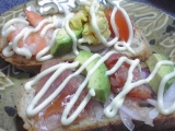 先日 (6/7日記) のドイツパンのルジーブレッドを、私なりに調理してみました 軽くトーストして紫たまねぎのスライスと生ハムとアボガドとエビとスクラ