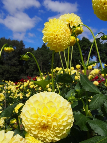 広島へ観光に行った時のひとこま 秋の花、ダリアが青い空と美しいコントラストをおりなす風景 あまりに美しく1時間近く立ちつくしていました