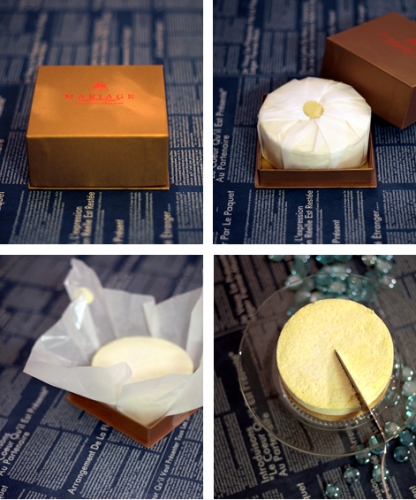 確りとしたゴールドのパッケージを開封すると、さらにデリケートに包み込まれた繊細なケーキ