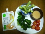 マルコメ 野菜がおいしいバーニャカウダ風ディップソースを食べてみました家の冷蔵庫にあった野菜スティック(きゅうり)、プチトマト、ゆでたブロッコリーを用意茶色い小皿に入っているのが野菜がおいしいバーニャカウダ風ディップソースですアンチョビの旨味やガーリックの風味が特徴のディップソースはさらっとしていて、みその甘さ、そして後から煮干しの風味を感じましたやさしい味付けなので、たーっぷりつけて食べると野菜がモリモリ食べられます口の中いっぱいに広がったバーニャカウダ風ディップソースがこれまたビールとよく合いますよぉ家にある野菜でかんたんに酒の肴が一品作れるのがうれしいですねごちそうさまでしたマルコメファンコミュニティファンサイト応援中 続きを見る ['close']