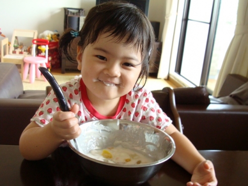 ヨーグルトとフルーツでババロアを作っていたら、いつの間にか、お玉で試食! にやっと笑う口の横には、はっきりババロアが! 口より大きなお玉だったので、ヒゲが出来ました
