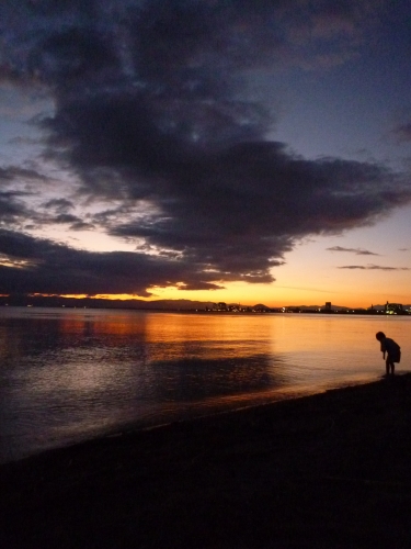 日が沈んで夜になりかけている琵琶湖の風景です雲が多かったのですが、夕暮れのオレンジと夜の深い青のグラデーションがとても綺麗で、思わずシャッターを切りました