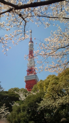 満開の桜のピンクと東京タワーの赤、そして空の青と素晴らしい春を満喫しました