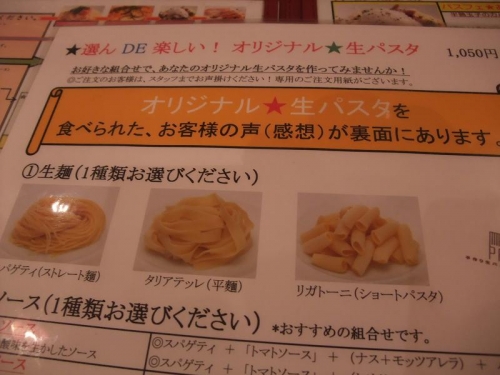 また、少しメニューに戻りますが、ここの場合、自分でパスタの作り方をオーダーできる「オリジナル生パスタ」というメニューも用意してるんですね自分の好みに合わせてパスタを用意してくれるんなんて、なかなかうれしいサービスです次回は、これに挑戦したいですね