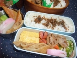 春巻き(いただきものを冷凍してあったの) レンコンとつくね団子の煮物 ウリとツナの和え物 ダシ巻き卵 かまぼこ ウインナー 本格だしパッ